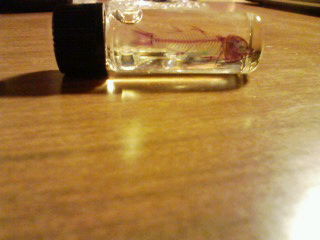特殊な液体につけ、筋肉を透明にし、軟骨を青く、硬骨を赤く染めるそうです。